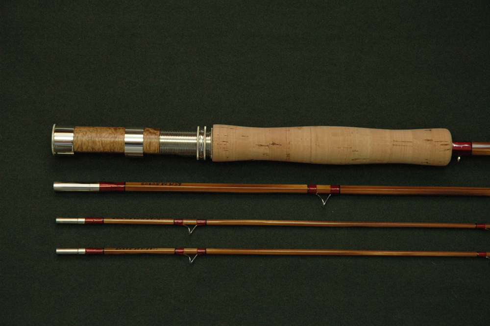 | You can completely customize your rod. You start by choosing a contemporary or classic rod taper from our rod database of over 600 rod tapers, then choose the style and size of the grip, the color of the wraps and tipping, the color of the bamboo (blond medium or dark brown), specify a swelled butt, lighten the rod via flueting, select blued or bright NS ferrules, select the type of reel seat and select from exotic burl wood inserts, specify pentagonal (5 strip) or hexagonal (6 strip) or other construction and any other custom element you can think of. Please call to discuss your rod desires and with any questions. etc. |