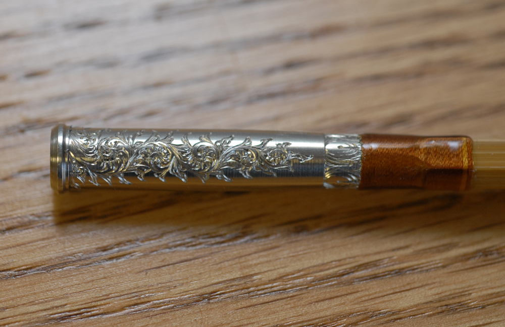 --SOLD OUT-- Our current offering is a 7', 2 piece, 2 tip, 4 weight Claude M. Krider rod, designed by Claude in the early 1950's, but redesigned for a 4 weight line, and hollowed for lighter weight and faster action. It comes in a blond or medium brown (ammonia treated) color with a custom grip, made from 1/4" vs. 1/2" cork rings, agate stripper, exotic burl wood insert, and distinctive wraps of the finest silk. The reel seat hardware, and ferrules are hand engraved by Charles E. Lee of Ione, California, formerly of James Purdey & Sons, London (See http://www.purdey.com). Charles has many years of engraving experience and does exquisite work as can bee seen in the various photographs. |