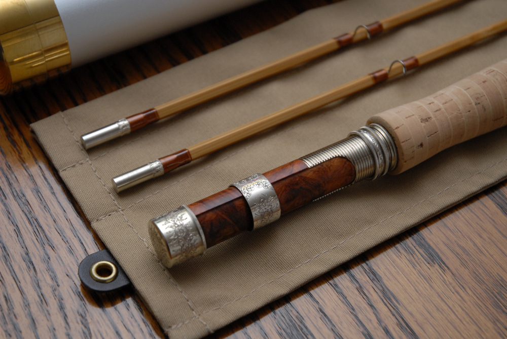 This is a pentagonal (5 sided) rod, and has a medium/fast action. As with all our rods, it comes with a quality rod bag and custom aluminum tube with solid brass ends complete with our name and logo. Pictured is serial #1 (of 12) in blond. Claude made his rods in either blond or ammonia treated (even brown) color, so accordingly, we offer both. The rod is priced at $2,499.99. Please call to reserve yours. Only twelve will be handcrafted. Read why we and others believe pentagonal (5-sided) rods are superior to even sided rods. Please call for more information. |